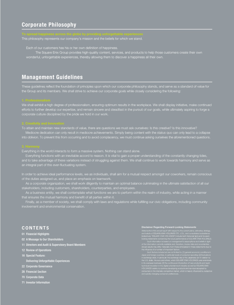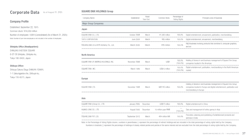 Corporate Data as of August 31, 2025 outlines the structure and financial standing of Square Enix Holdings Group. The parent company, established in 1975, reports consolidated common stock of ¥24 039 million and employs 4 604 full‑time staff as of March 31, 2025. The group’s core activities span digital entertainment, amusement, publication, and merchandising, with full voting control across all subsidiaries.