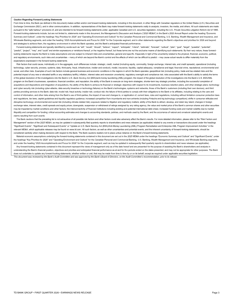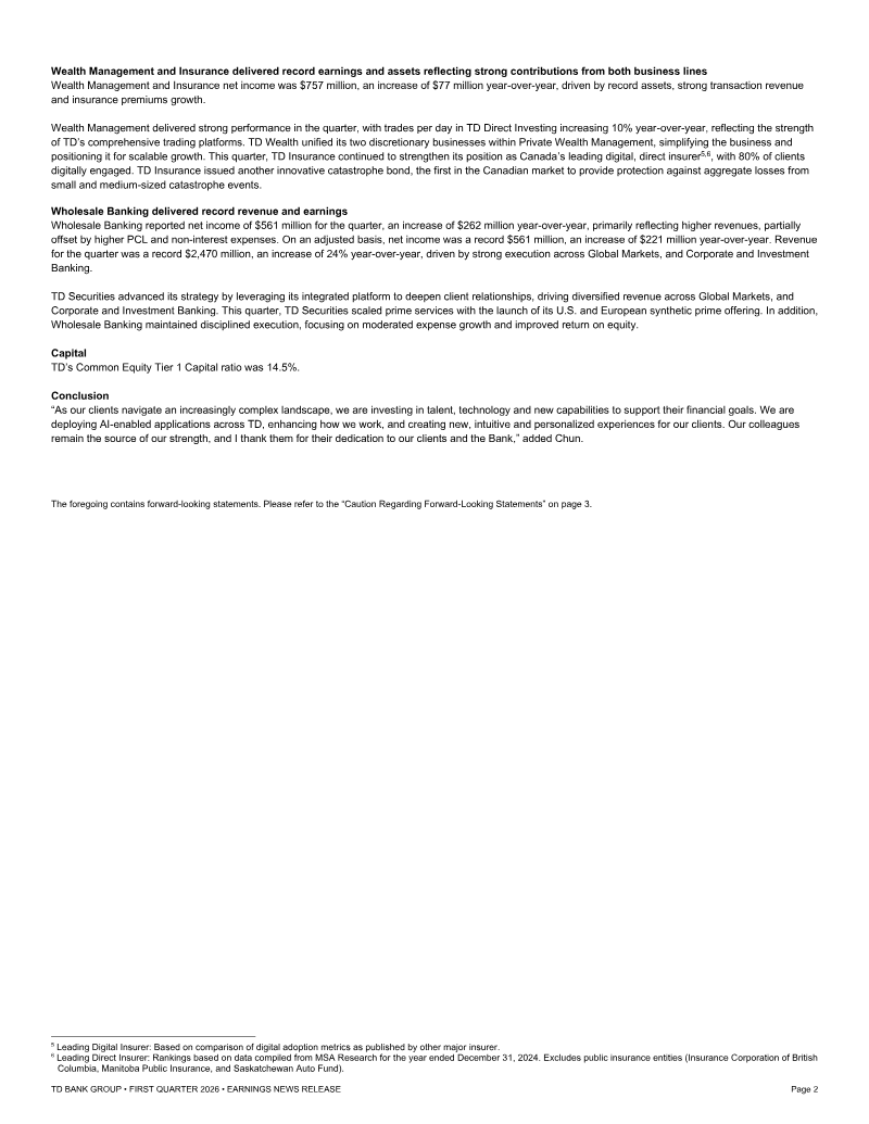 TD Bank Group Reports First Quarter 2026 Results Earnings News Release • Three months ended January 31, 2026 This quarterly Earnings News Release (ENR) should be read in conjunction with the Bank’s unaudited first quarter 2026 Report to Shareholders for the three months ended January 31, 2026, prepared in accordance with International Financial Reporting Standards (IFRS) as issued by the International Accounting Standards Board (IASB), which is available on our website at http://www.td.com/inves...