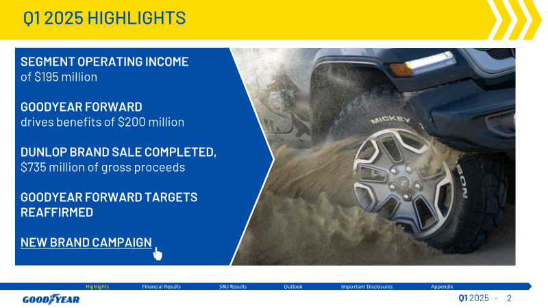 Q1 2025 | MAY 8, 2025 GOOD YEAR Q12025 MAY 8, 2025 FORWARD GOODYEAR FORWARD MICKE drives benefits of $200 million $735 million of gross proceeds Highlights Financial Results SBU Results Outlook Important Disclosures Appendix Highlights Financial Results SBU Results Outlook Important Disclosures Appendix Tire Units Net Sal Tire Units Net Sales Segment Operating Income $4,2 38.5 $4,253 $195 -4.8% YoY -6.3...
